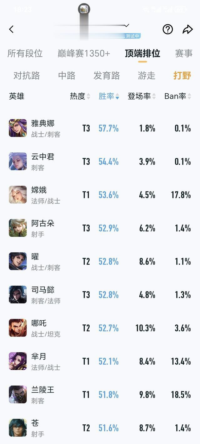 在王者荣耀高分段中,打野中胜率排名靠前的大部分都是一些冷门英雄。这类英雄的操作难度相对会高一些,玩的人少,但是上限也比较高,通常是一些绝活哥在玩。比如下面这些: